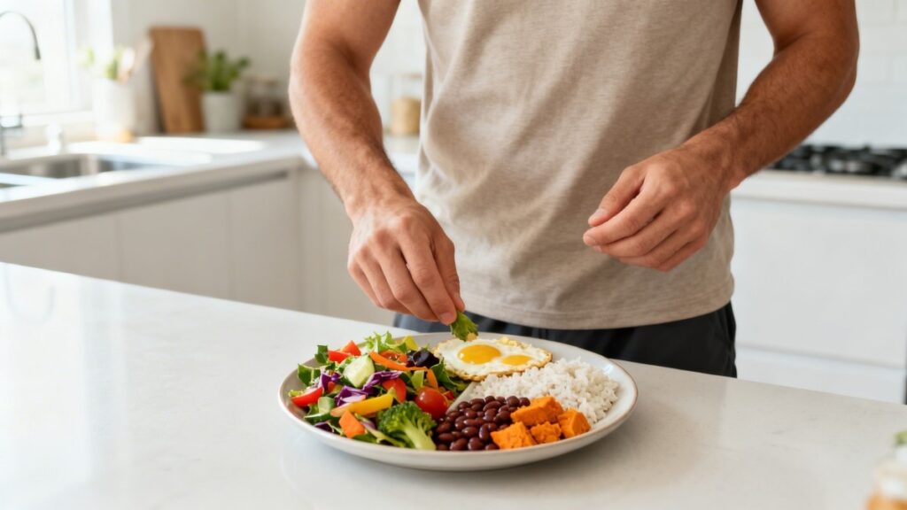 Montando um prato equilibrado com legumes, proteína e carboidrato